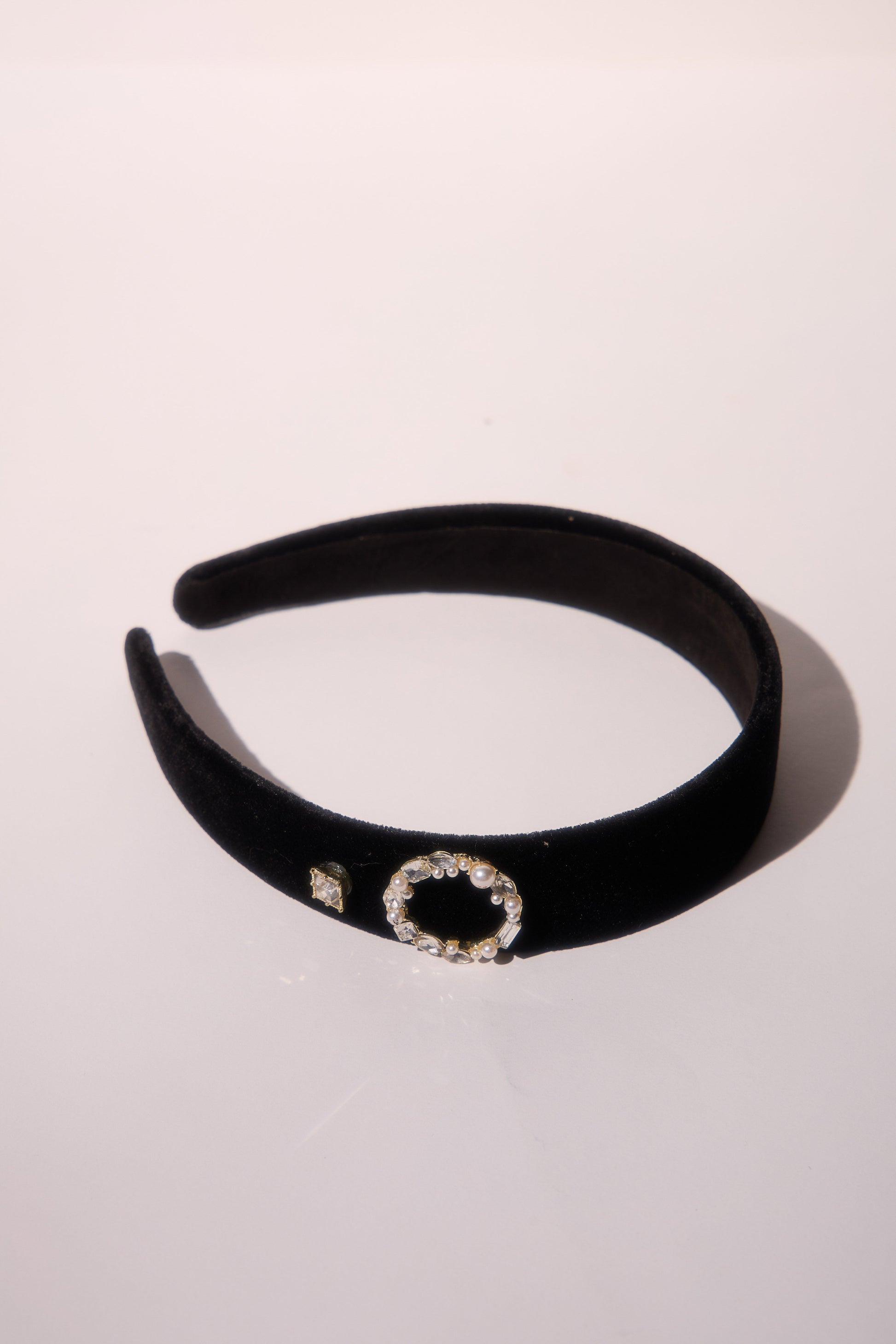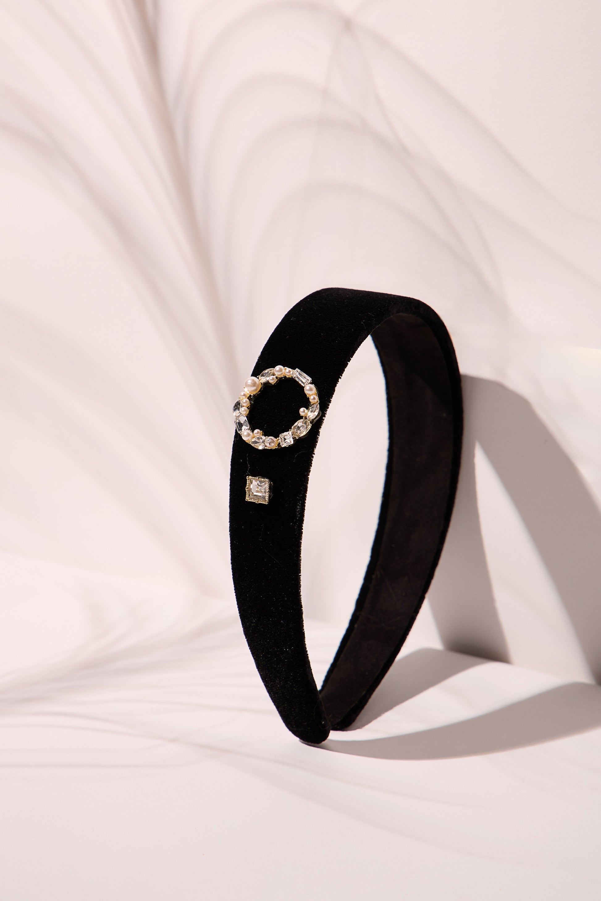 A black velvet headband with a silver brooch, combining elegance and charm.